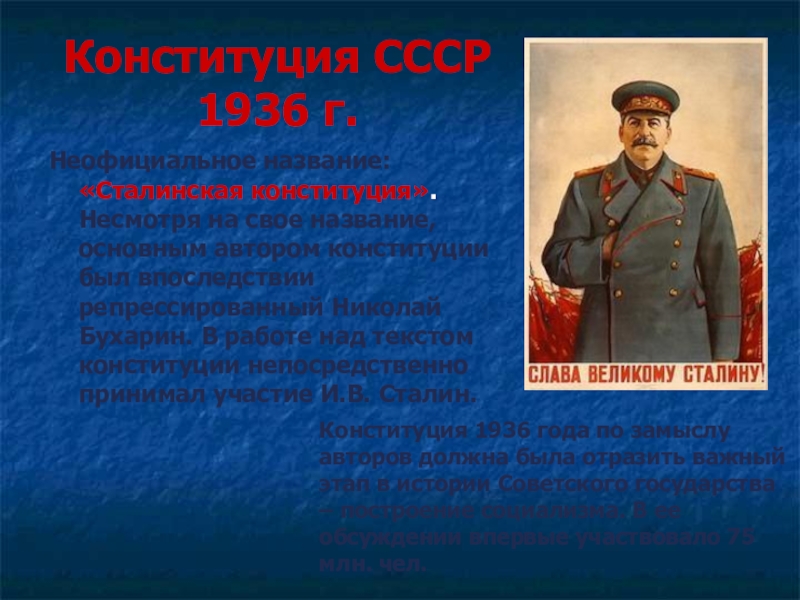 Конституция 1936 года по замыслу авторов должна была отразить важный этап в истории Советского государства – построение социализма. В ее обсуждении впервые участвовало 75 млн. чел.