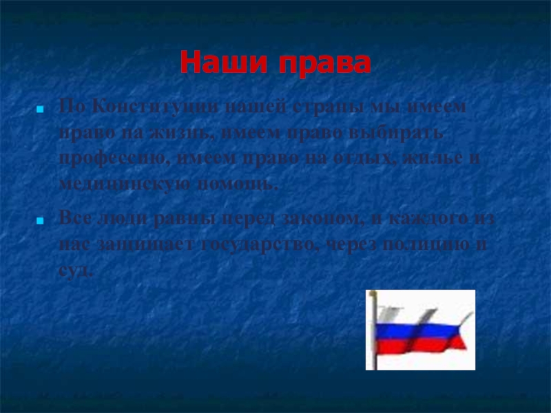 По Конституции нашей страны мы имеем право на жизнь, имеем право выбирать профессию, имеем право на отдых, жилье и медицинскую помощь.