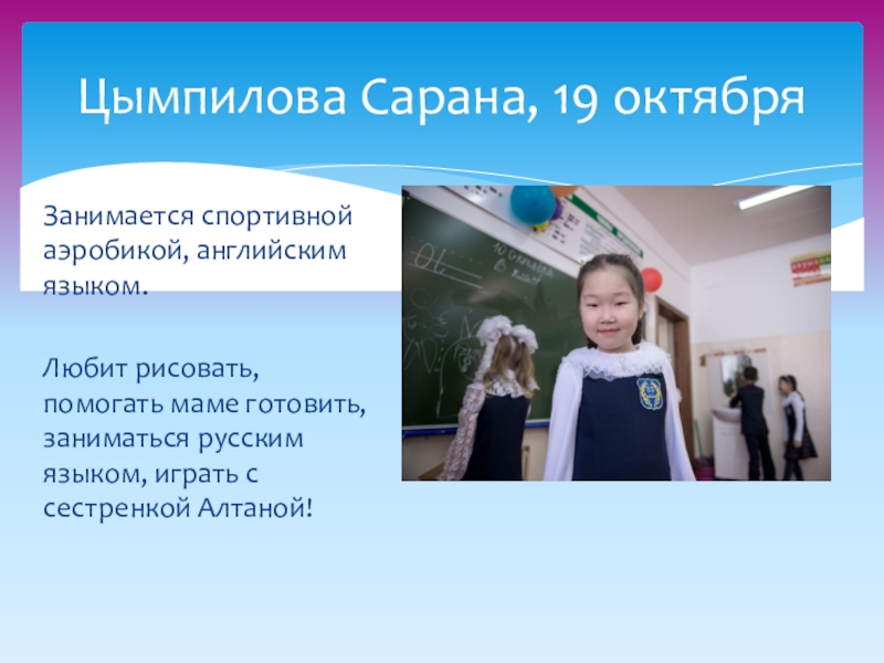 Слайд 22Занимается спортивной аэробикой, английским языком.