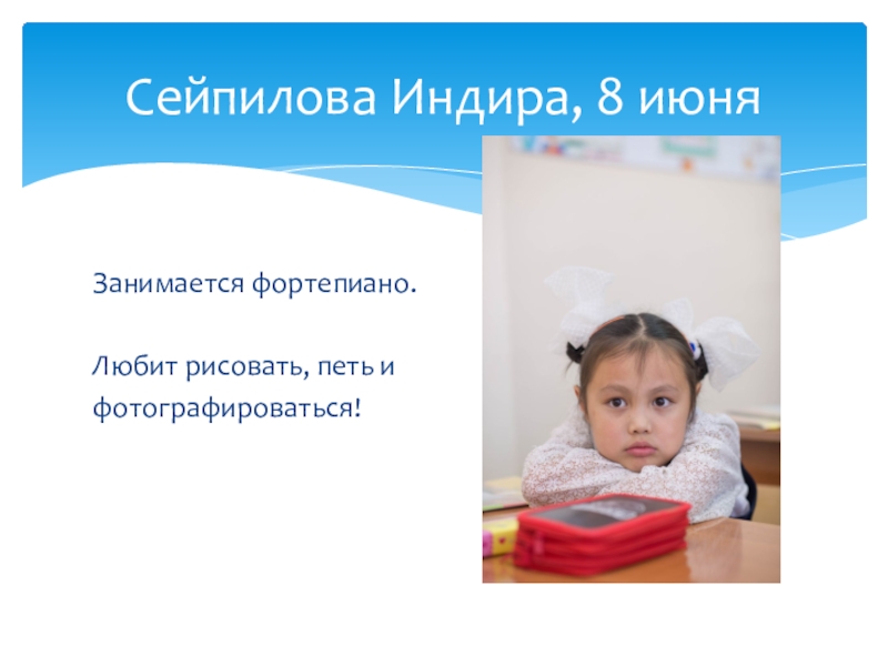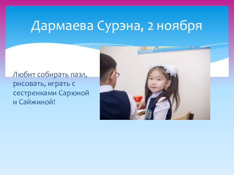 Слайд 27Любит собирать пазл, рисовать, играть с сестренками Сарюной и Сайжиной!