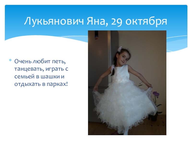 Слайд 24Очень любит петь, танцевать, играть с семьей в шашки и отдыхать