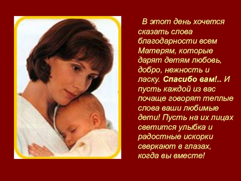 Матерям, которые дарят детям любовь, добро, нежность и ласку. Спасибо вам!.. И пусть каждой из вас почаще говорят теплые слова ваши любимые дети! Пусть на их лицах светится улыбка и радостные искорки сверкают в глазах, когда вы вместе!