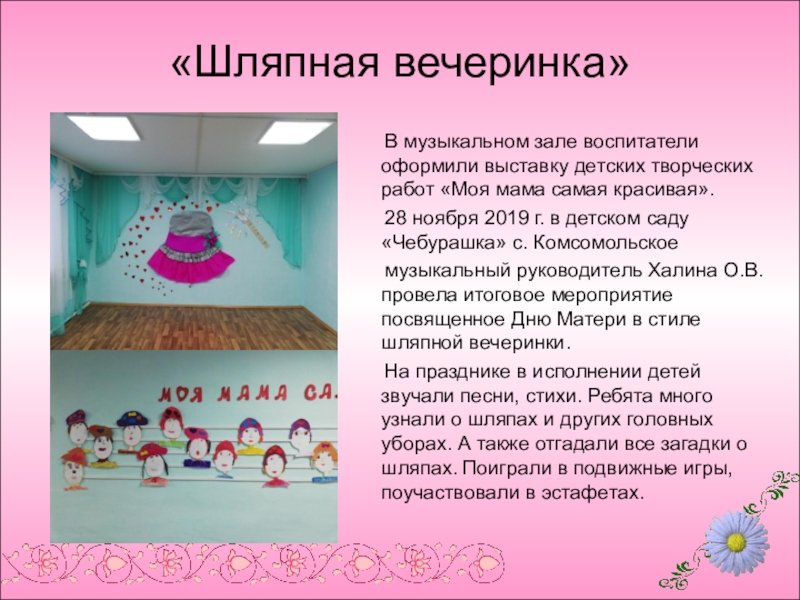 «Шляпная вечеринка»   В музыкальном зале воспитатели оформили выставку детских творческих работ «Моя мама самая красивая».