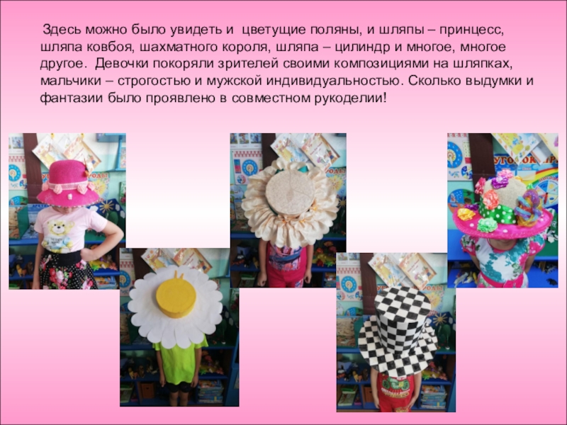 шляпы – принцесс, шляпа ковбоя, шахматного короля, шляпа – цилиндр и многое, многое другое. Девочки покоряли зрителей своими композициями на шляпках, мальчики – строгостью и мужской индивидуальностью. Сколько выдумки и фантазии было проявлено в совместном рукоделии!
