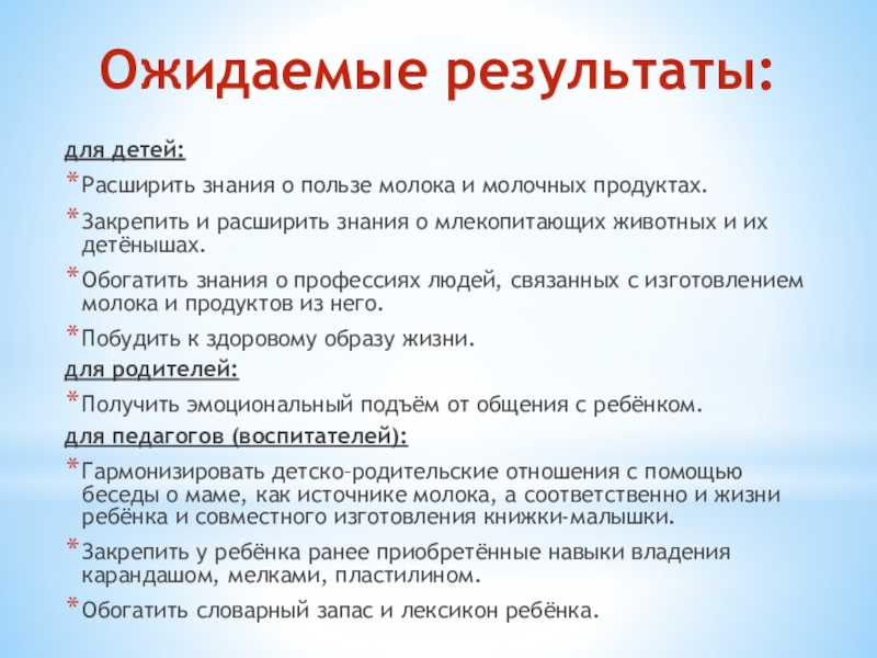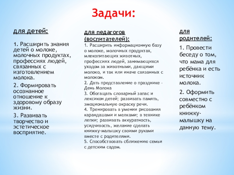 1. Расширить информационную базу о молоке, молочных продуктах, млекопитающих животных, профессиях людей, занимающихся уходом за животными, дающими молоко, и так или иначе связанных с молоком.