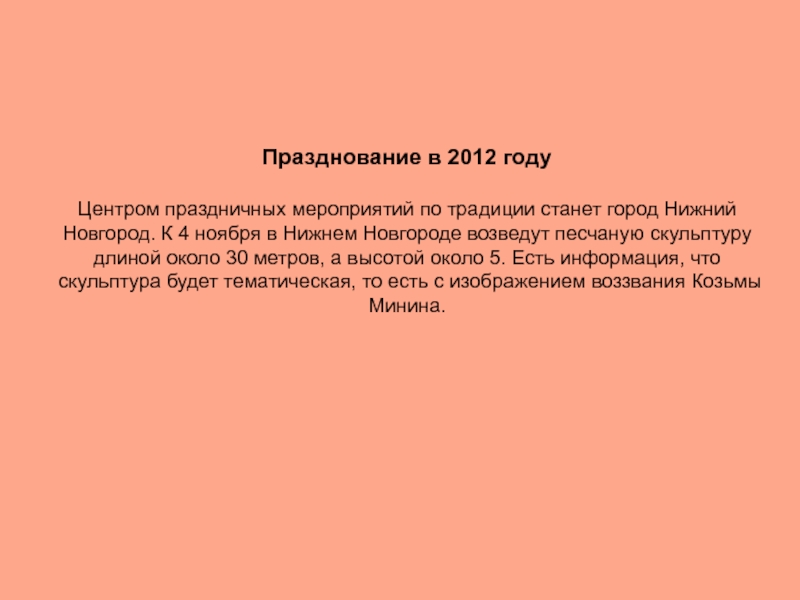 Новгород. К 4 ноября в Нижнем Новгороде возведут песчаную скульптуру длиной около 30 метров, а высотой около 5. Есть информация, что скульптура будет тематическая, то есть с изображением воззвания Козьмы Минина.