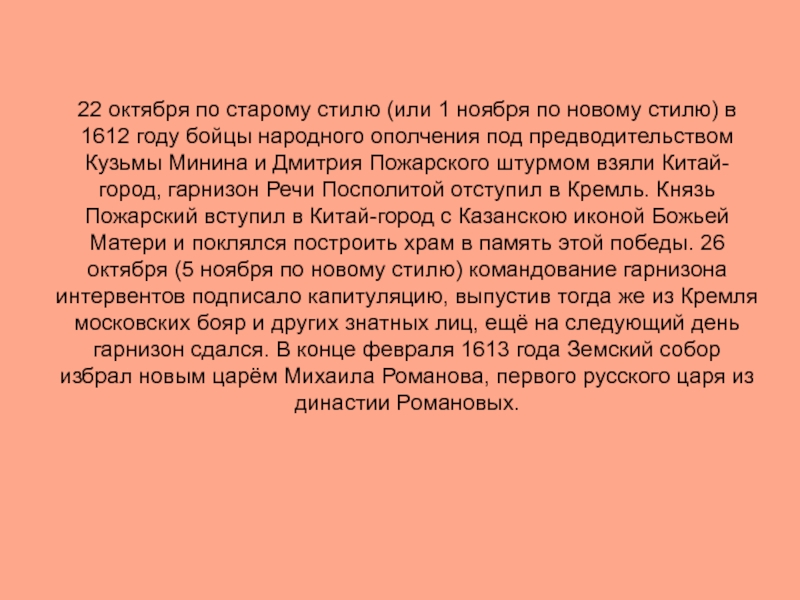 в 1612 году бойцы народного ополчения под предводительством Кузьмы Минина и Дмитрия Пожарского штурмом взяли Китай-город, гарнизон Речи Посполитой отступил в Кремль. Князь Пожарский вступил в Китай-город с Казанскою иконой Божьей Матери и поклялся построить храм в память этой победы. 26 октября (5 ноября по новому стилю) командование гарнизона интервентов подписало капитуляцию, выпустив тогда же из Кремля московских бояр и других знатных лиц, ещё на следующий день гарнизон сдался. В конце февраля 1613 года Земский собор избрал новым царём Михаила Романова, первого русского царя из династии Романовых.