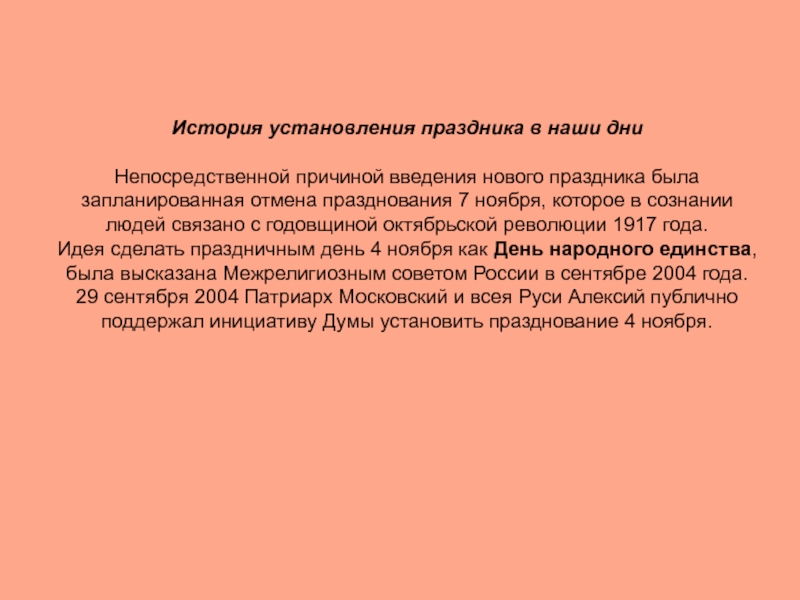29 сентября 2004 Патриарх Московский и всея Руси Алексий публично поддержал инициативу Думы установить празднование 4 ноября.