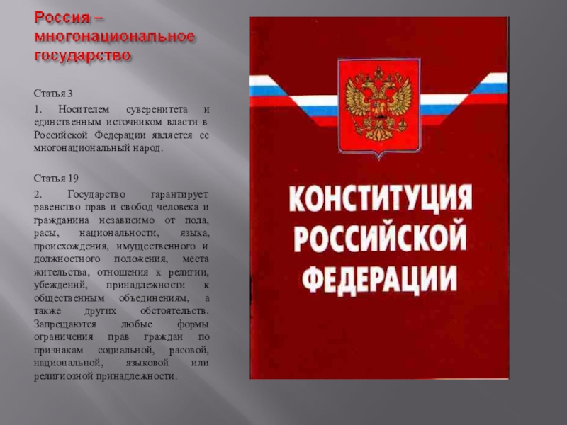 2. Государство гарантирует равенство прав и свобод человека и гражданина независимо от пола, расы, национальности, языка, происхождения, имущественного и должностного положения, места жительства, отношения к религии, убеждений, принадлежности к общественным объединениям, а также других обстоятельств. Запрещаются любые формы ограничения прав граждан по признакам социальной, расовой, национальной, языковой или религиозной принадлежности.