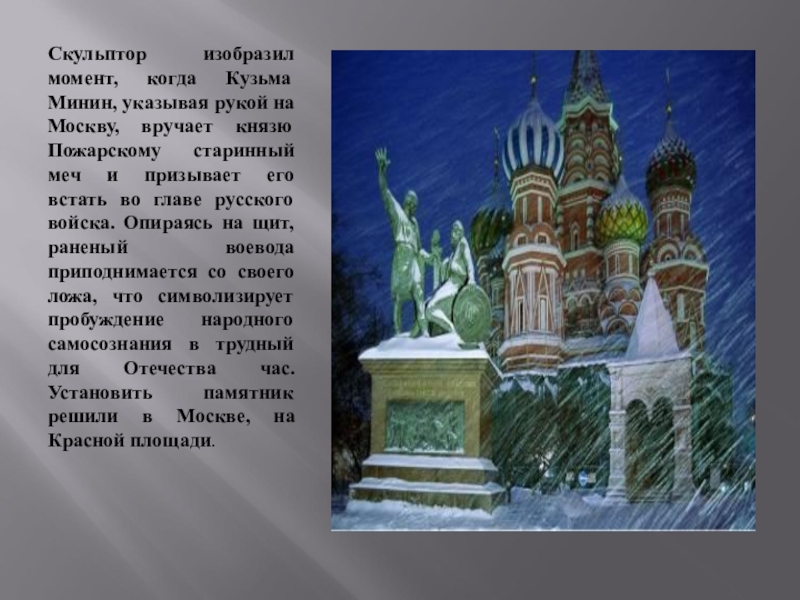 князю Пожарскому старинный меч и призывает его встать во главе русского войска. Опираясь на щит, раненый воевода приподнимается со своего ложа, что символизирует пробуждение народного самосознания в трудный для Отечества час. Установить памятник решили в Москве, на Красной площади.