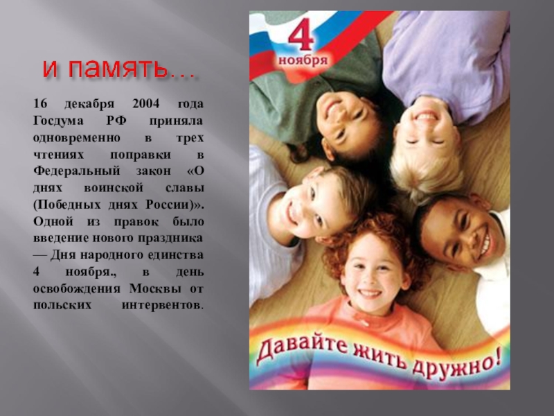 поправки в Федеральный закон «О днях воинской славы (Победных днях России)». Одной из правок было введение нового праздника — Дня народного единства 4 ноября., в день освобождения Москвы от польских интервентов.
