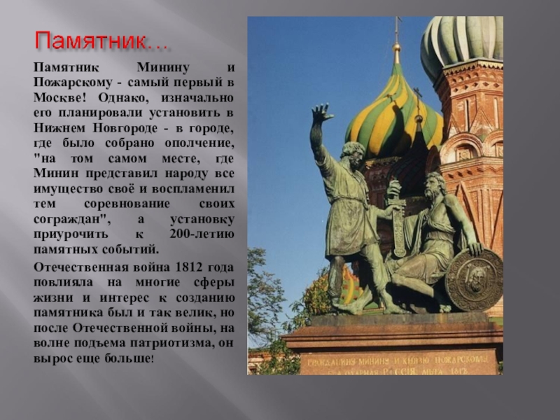 Слайд 12Памятник Минину и Пожарскому - самый первый в Москве! Однако, изначально