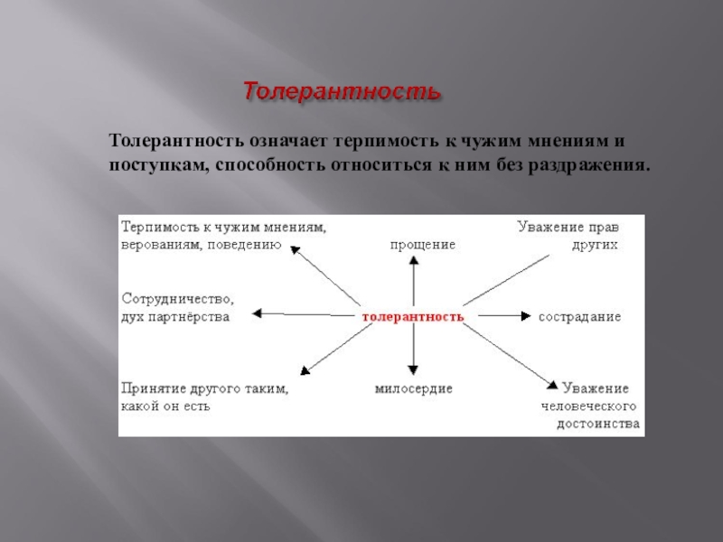 Слайд 16Толерантность означает терпимость к чужим мнениям и поступкам, способность относиться к