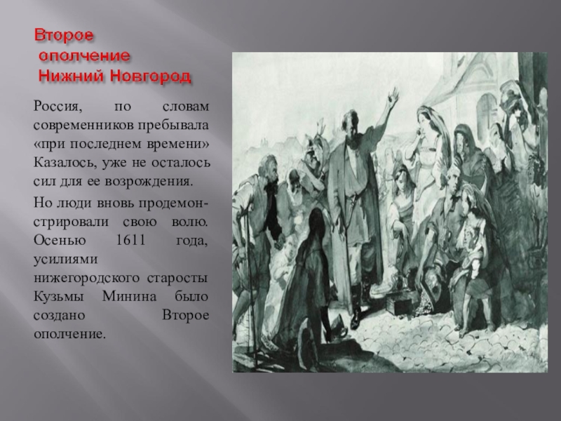 Но люди вновь продемон- стрировали свою волю. Осенью 1611 года, усилиями нижегородского старосты Кузьмы Минина было создано Второе ополчение.