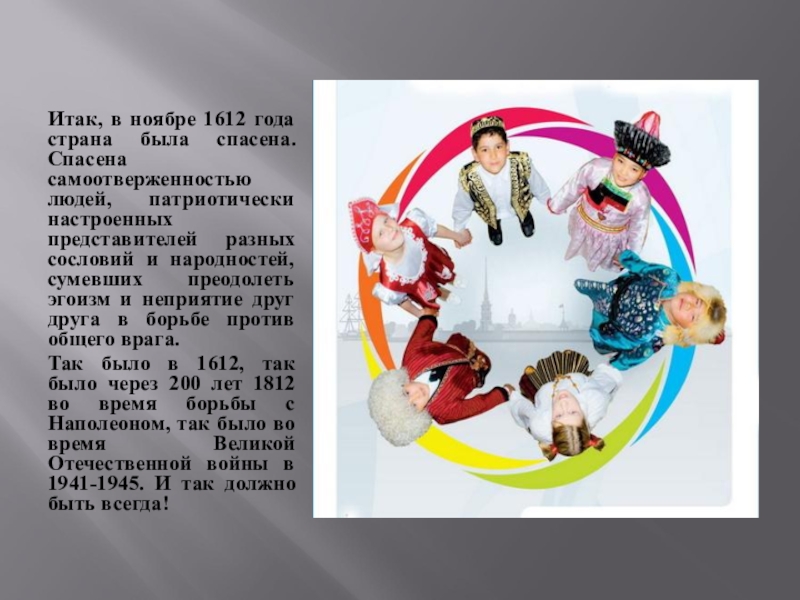 Так было в 1612, так было через 200 лет 1812 во время борьбы с Наполеоном, так было во время Великой Отечественной войны в 1941-1945. И так должно быть всегда!