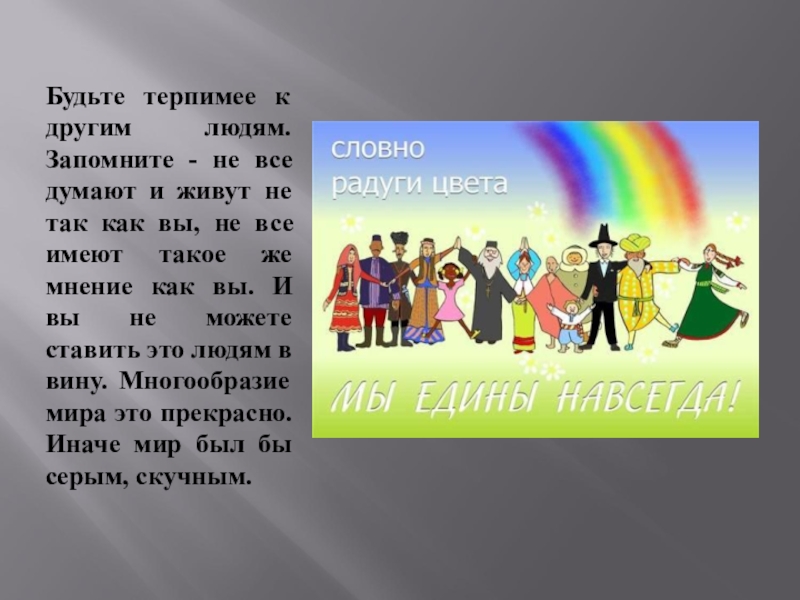 Слайд 17Будьте терпимее к другим людям. Запомните - не все думают и