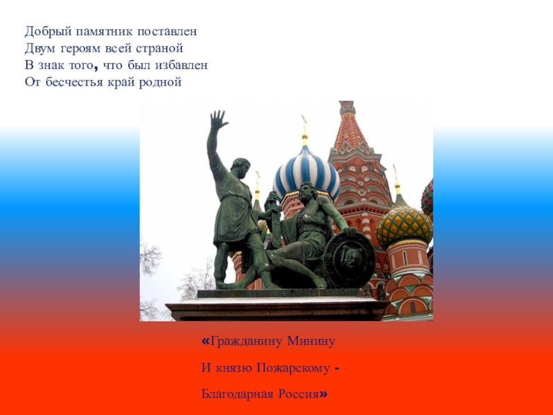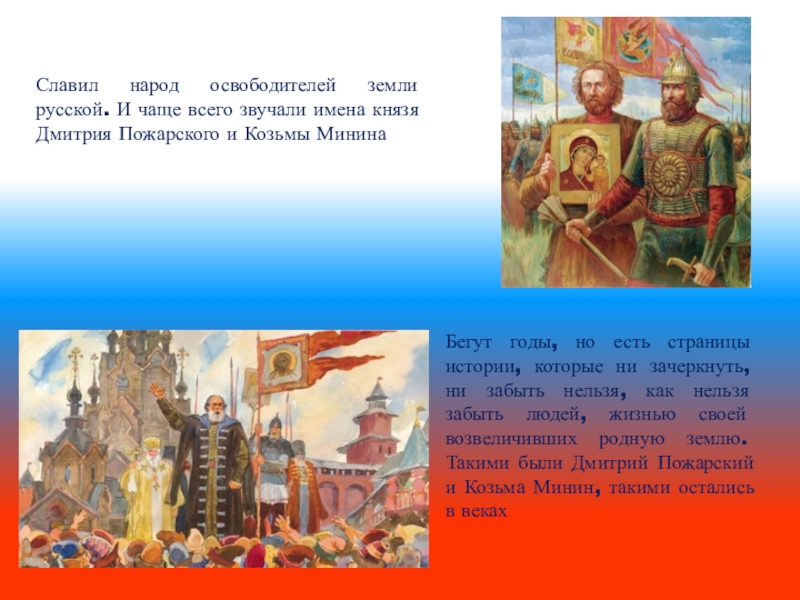 Бегут годы, но есть страницы истории, которые ни зачеркнуть, ни забыть нельзя, как нельзя забыть людей, жизнью своей возвеличивших родную землю. Такими были Дмитрий Пожарский и Козьма Минин, такими остались в веках
