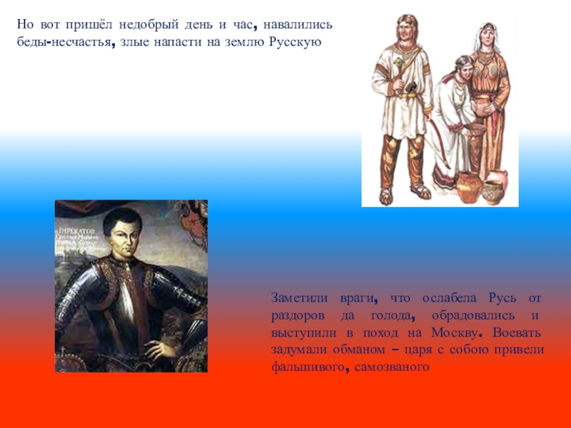 Заметили враги, что ослабела Русь от раздоров да голода, обрадовались и выступили в поход на Москву. Воевать задумали обманом – царя с собою привели фальшивого, самозваного