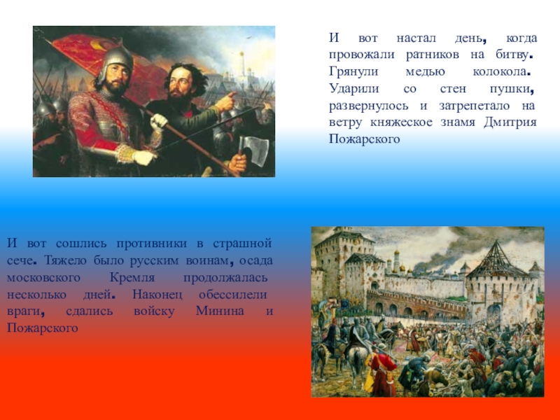 И вот сошлись противники в страшной сече. Тяжело было русским воинам, осада московского Кремля продолжалась несколько дней. Наконец обессилели враги, сдались войску Минина и Пожарского