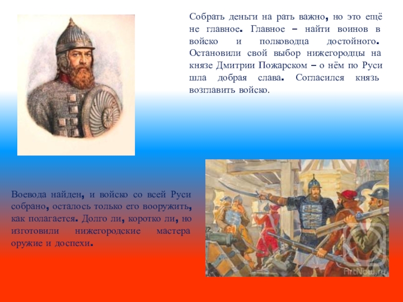 Воевода найден, и войско со всей Руси собрано, осталось только его вооружить, как полагается. Долго ли, коротко ли, но изготовили нижегородские мастера оружие и доспехи.