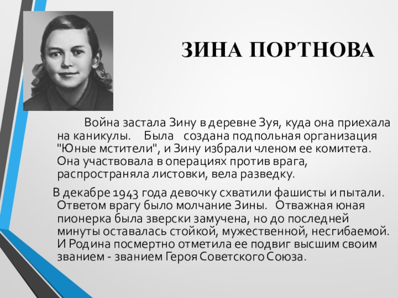 приехала на каникулы. Была создана подпольная организация "Юные мстители", и Зину избрали членом ее комитета. Она участвовала в операциях против врага, распространяла листовки, вела разведку.