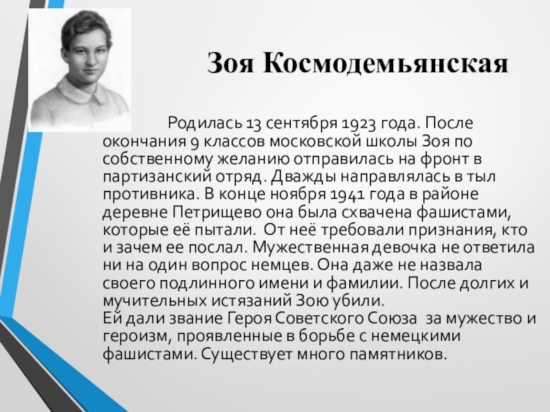 13 сентября 1923 года. После окончания 9 классов московской школы Зоя по собственному желанию отправилась на фронт в партизанский отряд. Дважды направлялась в тыл противника. В конце ноября 1941 года в районе деревне Петрищево она была схвачена фашистами, которые её пытали. От неё требовали признания, кто и зачем ее послал. Мужественная девочка не ответила ни на один вопрос немцев. Она даже не назвала своего подлинного имени и фамилии. После долгих и мучительных истязаний Зою убили.