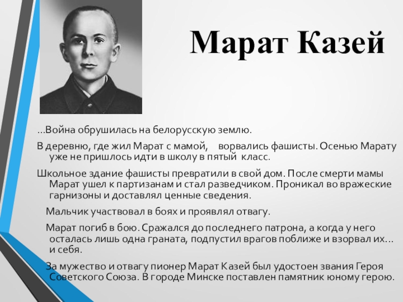 За мужество и отвагу пионер Марат Казей был удостоен звания Героя Советского Союза. В городе Минске поставлен памятник юному герою.