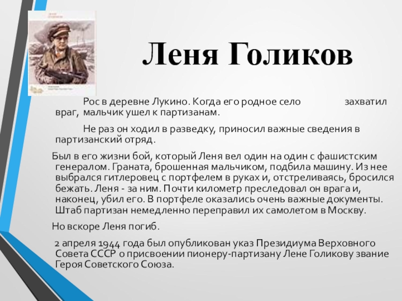 2 апреля 1944 года был опубликован указ Президиума Верховного Совета СССР о присвоении пионеру-партизану Лене Голикову звание Героя Советского Союза.