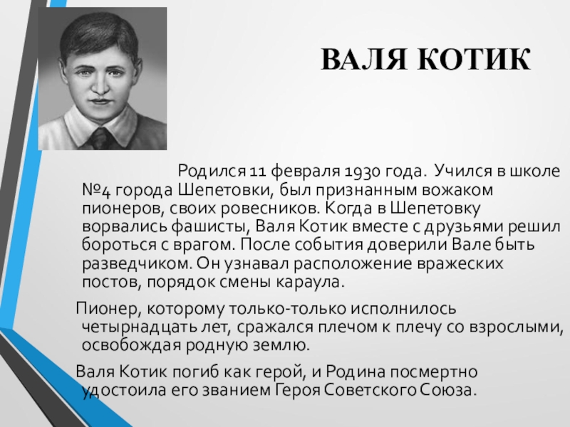 Учился в школе №4 города Шепетовки, был признанным вожаком пионеров, своих ровесников. Когда в Шепетовку ворвались фашисты, Валя Котик вместе с друзьями решил бороться с врагом. После события доверили Вале быть разведчиком. Он узнавал расположение вражеских постов, порядок смены караула.
