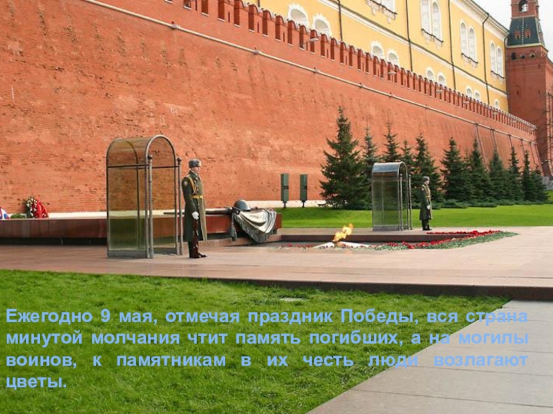 Слайд 31Ежегодно 9 мая, отмечая праздник Победы, вся страна минутой молчания чтит