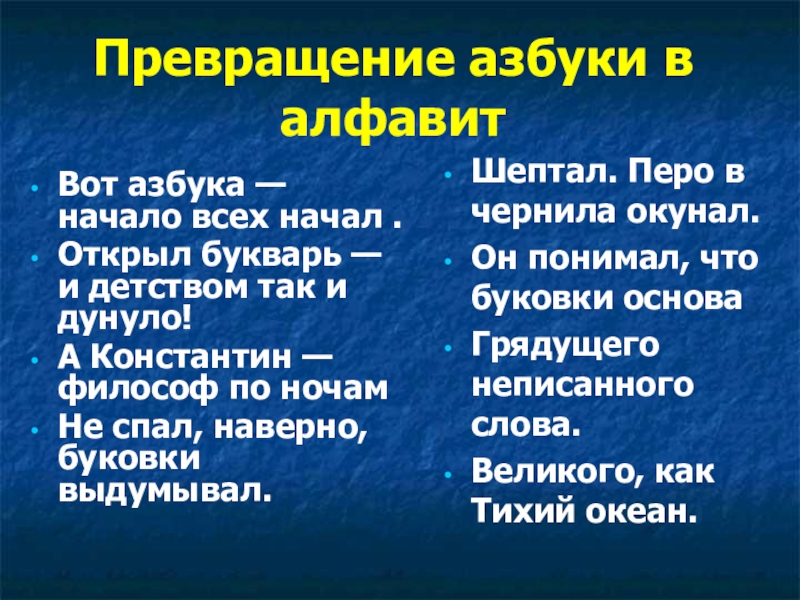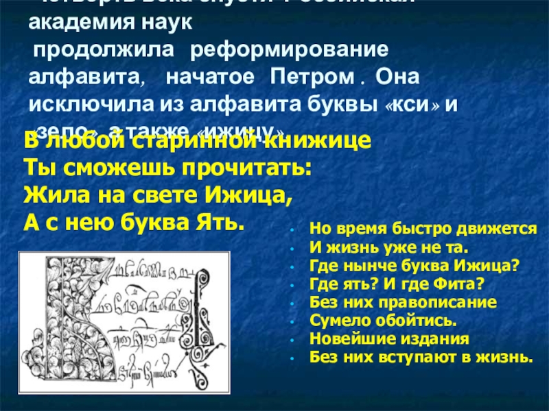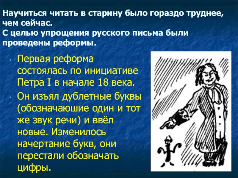 Он изъял дублетные буквы(обозначаюшие один и тот же звук речи) и ввёл новые. Изменилось начертание букв, они перестали обозначать цифры.