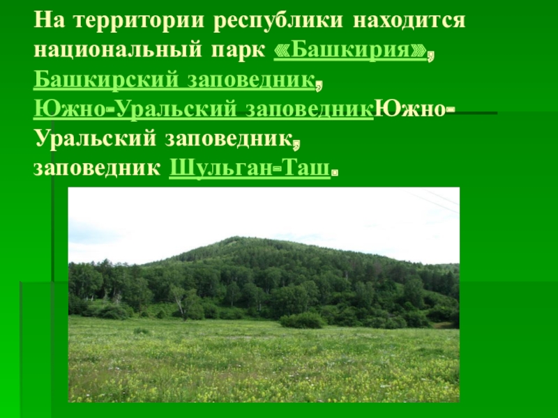 Слайд 18На территории республики находится национальный парк «Башкирия», Башкирский заповедник,  Южно-Уральский заповедникЮжно-Уральский заповедник, заповедник Шульган-Таш.
