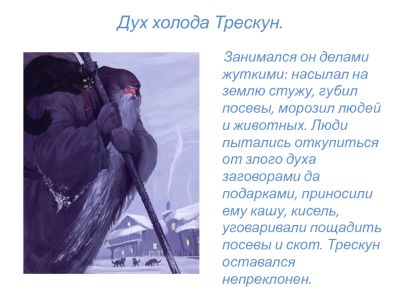 землю стужу, губил посевы, морозил людей и животных. Люди пытались откупиться от злого духа заговорами да подарками, приносили ему кашу, кисель, уговаривали пощадить посевы и скот. Трескун оставался непреклонен.