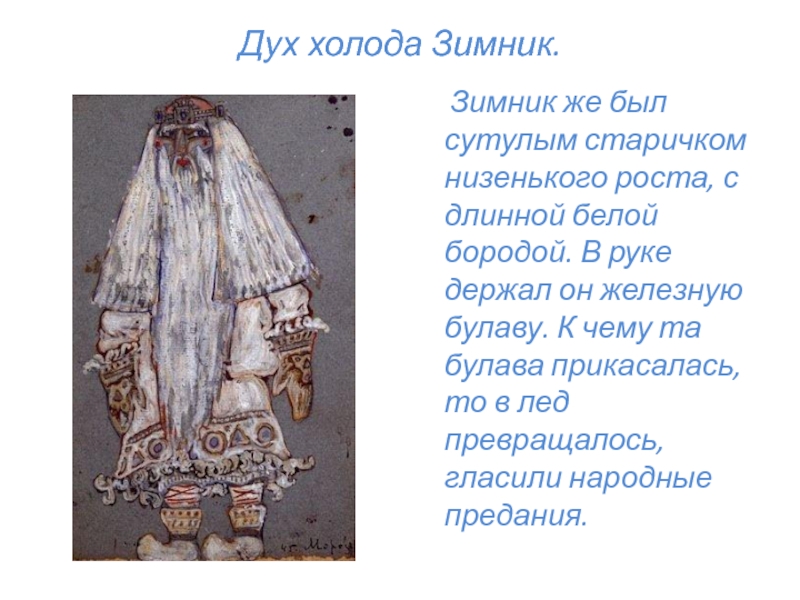 старичком низенького роста, с длинной белой бородой. В руке держал он железную булаву. К чему та булава прикасалась, то в лед превращалось, гласили народные предания.