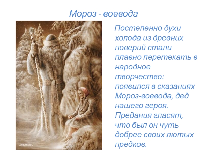 плавно перетекать в народное творчество: появился в сказаниях Мороз-воевода, дед нашего героя. Предания гласят, что был он чуть добрее своих лютых предков.