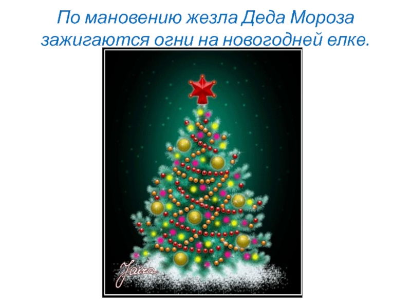 По мановению жезла Деда Мороза зажигаются огни на новогодней елке.
