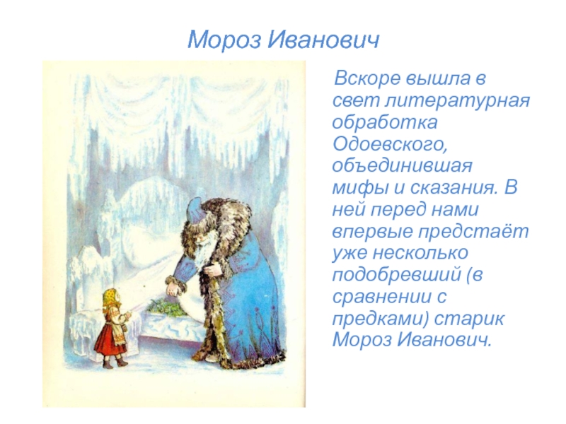 объединившая мифы и сказания. В ней перед нами впервые предстаёт уже несколько подобревший (в сравнении с предками) старик Мороз Иванович.