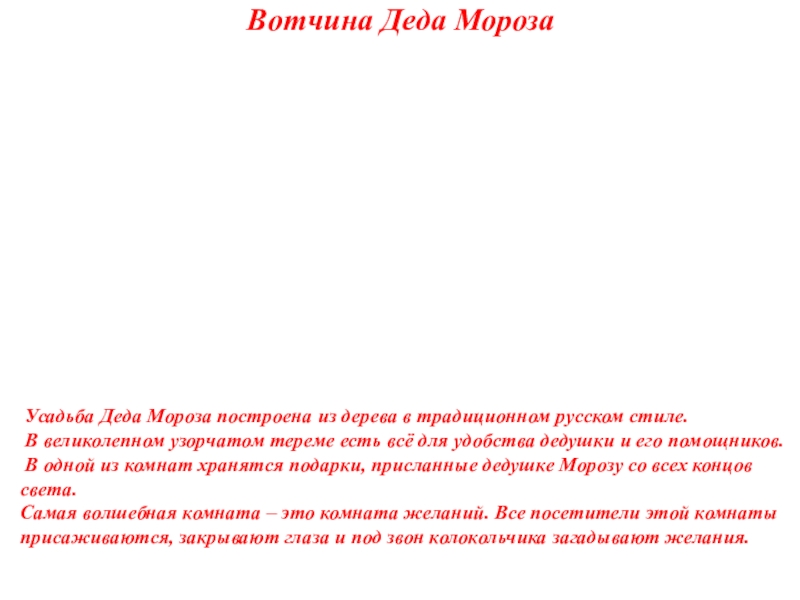 Вотчина Деда Мороза  Усадьба Деда Мороза построена из дерева в традиционном русском стиле. В великолепном узорчатом тереме
