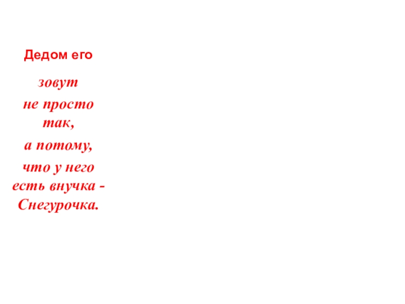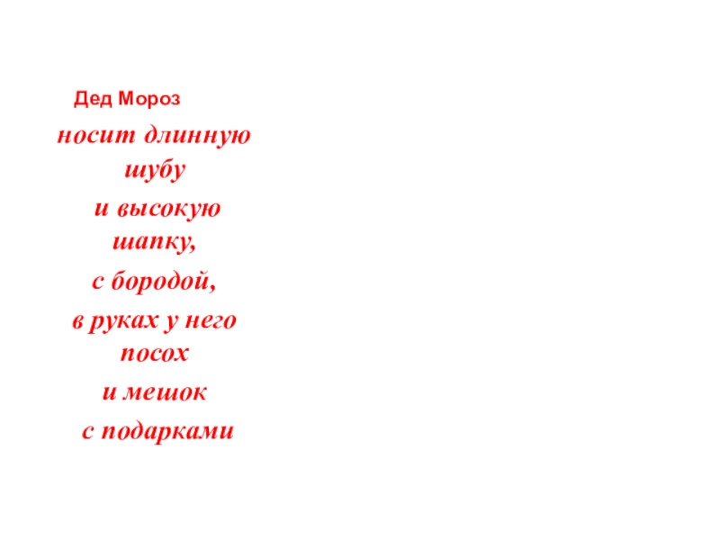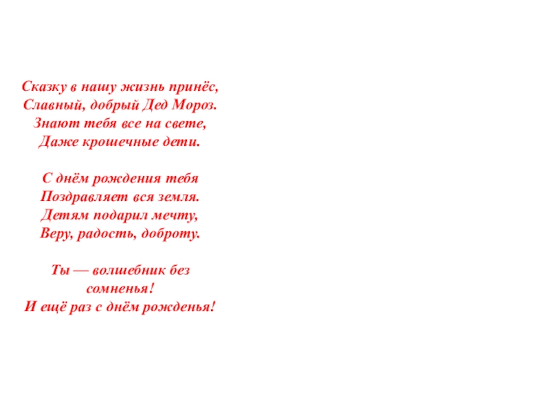Сказку в нашу жизнь принёс, Славный, добрый Дед Мороз. Знают тебя все на свете, Даже крошечные дети.