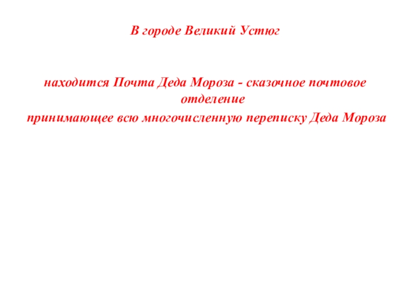 В городе Великий Устюг находится Почта Деда Мороза - сказочное почтовое отделение принимающее всю многочисленную переписку Деда