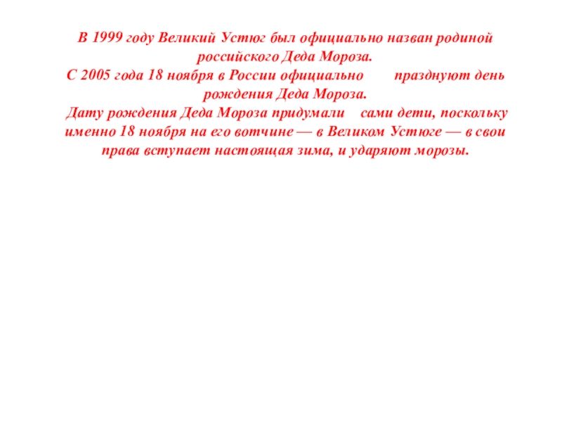Мороза. С 2005 года 18 ноября в России официально празднуют день рождения Деда Мороза. Дату рождения Деда Мороза придумали сами дети, поскольку именно 18 ноября на его вотчине — в Великом Устюге — в свои права вступает настоящая зима, и ударяют морозы.