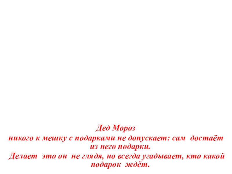 Дед Мороз никого к мешку с подарками не допускает: сам достаёт из него подарки.Делает это он не