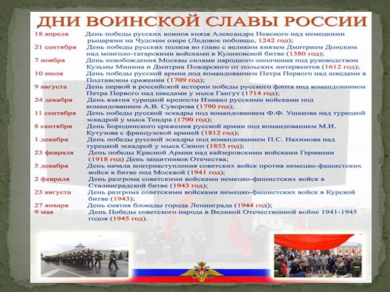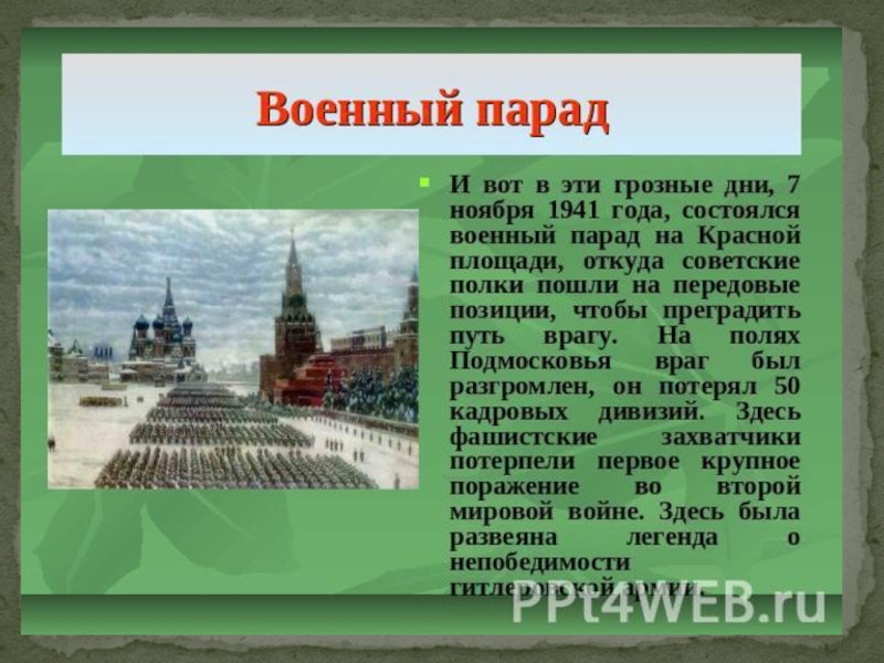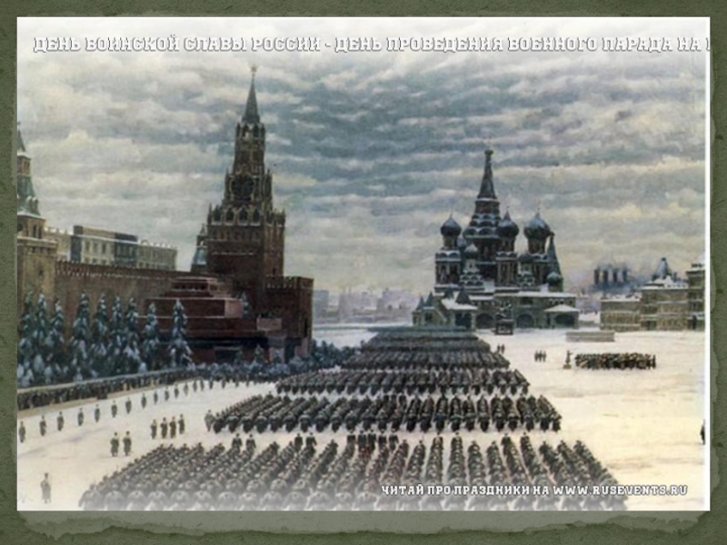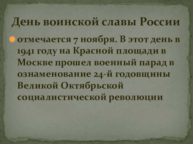 отмечается 7 ноября. В этот день в 1941 году на Красной площади в Москве прошел военный парад в ознаменование 24-й годовщины Великой Октябрьской социалистической революцииДень воинской славы России
