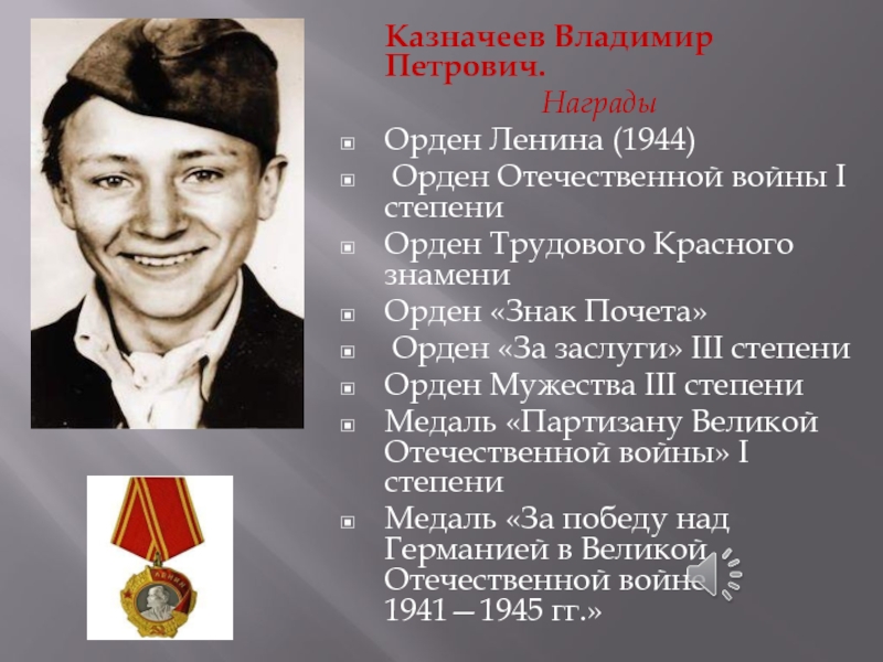 Казначеев Владимир Петрович.НаградыОрден Ленина (1944) Орден Отечественной войны I степениОрден Трудового Красного знамениОрден «Знак Почета» Орден