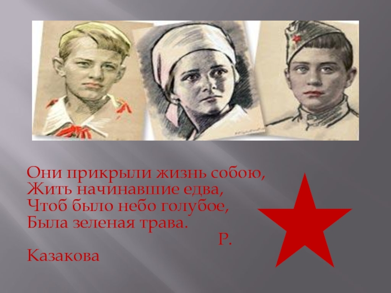Они прикрыли жизнь собою,Жить начинавшие едва,Чтоб было небо голубое, Была зеленая трава.