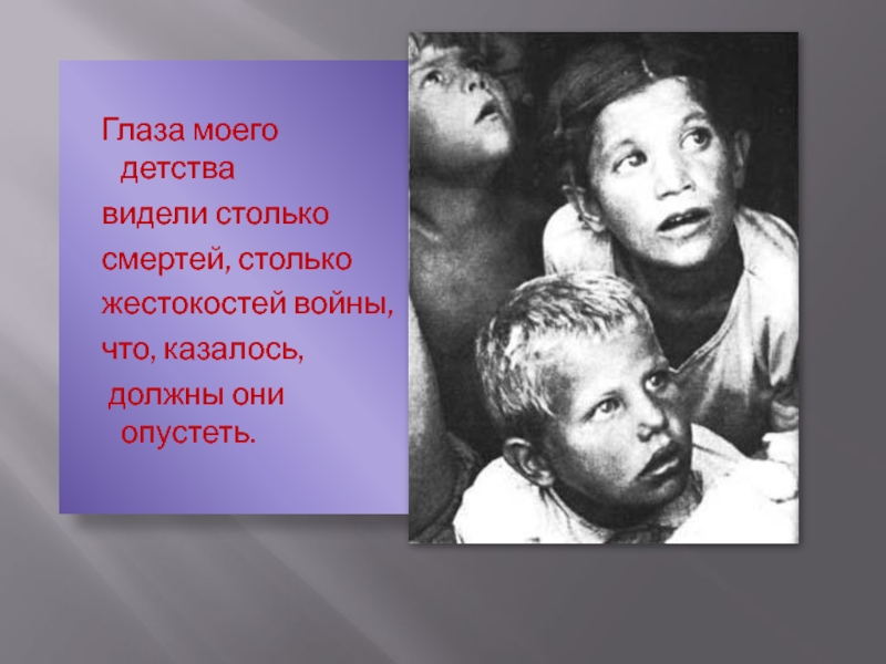 Глаза моего детства  видели столько  смертей, столько  жестокостей войны,  что, казалось,