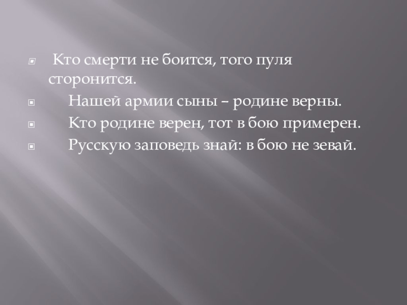 Кто смерти не боится, того пуля сторонится. Нашей армии сыны – родине верны. Кто родине верен, тот в бою примерен. Русскую заповедь знай: в бою не зевай.