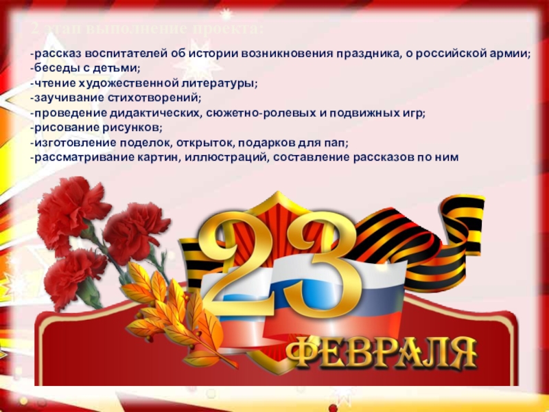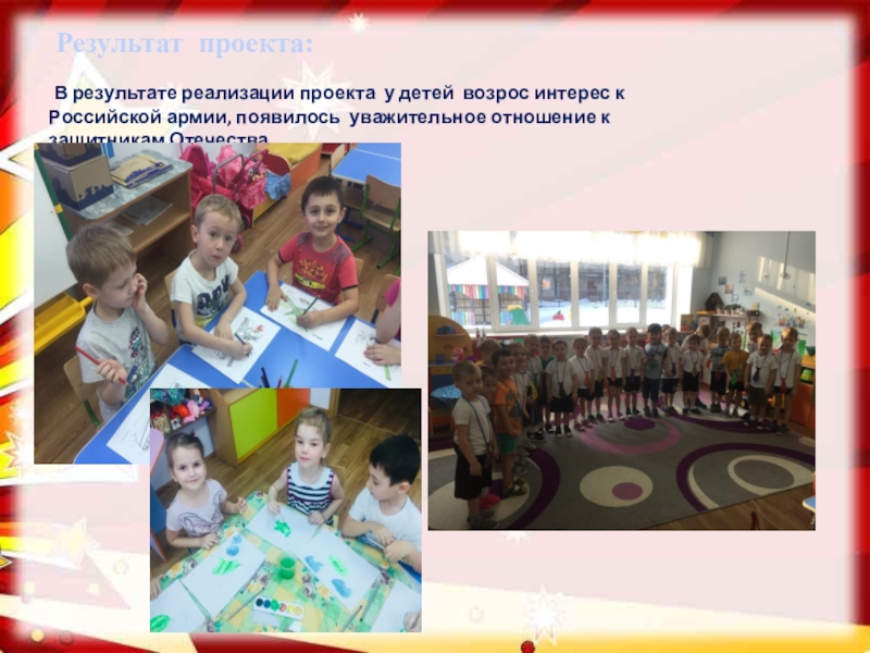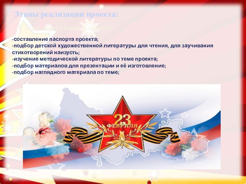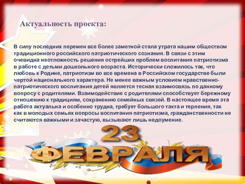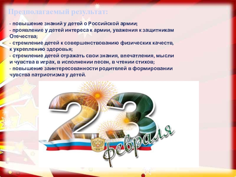 - проводить работу с родителями, привлекая их к патриотическому воспитанию детей в семье.
