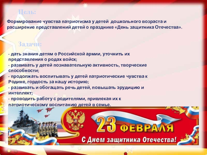 - дать знания детям о Российской армии, уточнить их представления о родах войск;