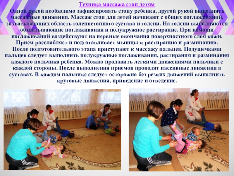 Слайд 3Техника массажа стоп детям Одной рукой необходимо зафиксировать стопу ребенка, другой рукой
